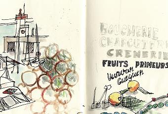 Aaah la Trinité sur Mer...j'ai grandi à côté et le diabolo fraise du Bar Tab est ma madeleine de Proust (il n'a rien de spécial, à part d'être dégusté par moi-même depuis 25 ans avec vue sur le port), et je passe au final plus de temps à en boire qu'à forcément dessiner, tellement je connais par coeur le paysage du port et de la baie. Alors un petit croquis comme cela entre mes 12h de sommeil (eh oui l'air marin ça vous fatigue une bretonne expatriée à la capitale...) et puis kenavo !