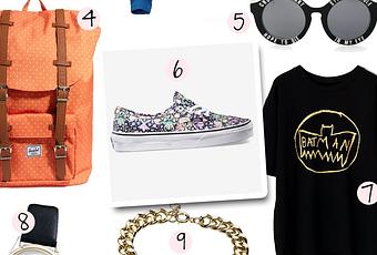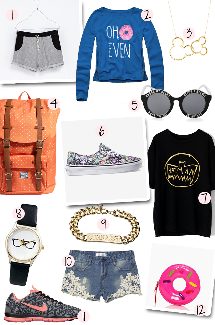 1. Bermuda à détails contrastants (Zara) : 16€95 | 2. Fallbrook Shine Sweatshirt (Hollister) : 44 € | 3. Collier à maillon Mickey Mouse (Gogo Philip chez Asos.fr) : 28€63 | 4. Little America (Herschel chez Asos.fr) : 91€09 | 5. In my Eye Round Sunglasses (Chicwish) : 15€85 | 6. Chaussures Authentic Liberty (Vans) : 75 € | 7. Batman Print oversized T-shirt (Chicwish) : 21€82 | 8. Montre motif lunettes (Asos) : 26€03 | 9. Gourmette Connasse (Félicie Aussi chez Le Corner des Créateurs) : 35 € | 10. Crochet detail denim Cutoff (Chicwish) : 29€77 |11. Free Tr III Printed (Nike) : 115 € | 12. Donut Coin purse (Kate Spade NY x Darcel) : 98 $