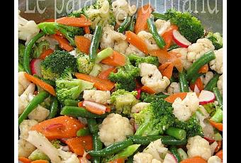 Plonger les 4 premiers ingrédients dans de l'eau bouillant quelques minutes, mais pas trop pour qu'ils gardent leur côtés croustillants. Passer à l'eau froide, bien égoutter et mettre dans un grand bol. Ajouter le reste des ingrédients, bien mélanger et mettre au réfrigérateur environ 30 minutes pour laisser le temps aux saveurs de s'imprégner entres elles. Assaisonner au besoin.