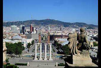Montjuïc, ce matin. Sculpture devant le musée des beaux arts de la catalogne (le MNAC), avec colonnades, cascades, fontaines, tours surmontées de colonnes grecques, avec au centre, le monument de la Plaza de Espana. Au centre-droit, l'ancienne Plaza de toros, une splendeur mudéjar qui date du tout début des années 1900, mais dont l'intérieur est aujourd'hui un centre commercial moderne ouvert en 2011. À l'horizon, les montagnes au nord de la ville, dont le sommet du Tibidabo. Les fans de la sitcom Friends devraient sourire à l'évocation du Tibidabo, "just outside Barcelona".