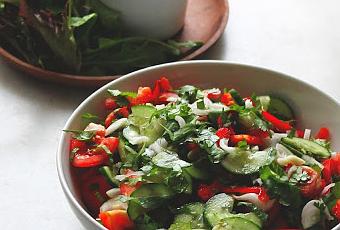 Laver les les légumes. Épépiner les tomates, les couper en dés. Tailler le poivron et le concombre. Émincer les oignons. Ôter la première feuille de la tige de citronnelle, en couper les extrémités et l'émincer finement. Prélever les feuilles de la branche de céleri, émincer la tige. Hacher grossièrement les feuilles de céleri, de coriandre et de menthe. Mélanger le tout dans un saladier.