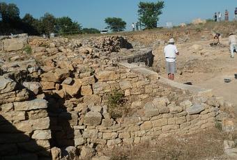 Patrick THOLLARD (en blanc sur la photo) nous explique comment et quand a été découvert le site antique, comment il se présentait au cours des siècles, puis ce qui a été mis à jour ces 3 derniers mois sur les différents lieux de la visite par les étudiants travaillant tout l'été sous un soleil de plomb...