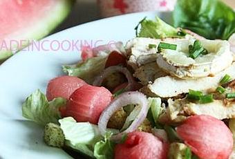 - Disposer à votre convenance les billes ou les morceaux de pastèque. Arroser de sauce vinaigrette, puis disposer au dessus les tranches de poulet.