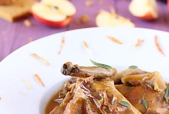 Je ne me lasse pas des plats mijotés à base de pain d’épices et de fruits. Je vous en ai déjà proposés sur ce blog et voici pour aujourd’hui une nouvelle version avec seulement 4 ingrédients. La sauce à base de cidre et de pain d’épices est très sirupeuse et riche de saveur. Elle s’accommode très bien avec la chair du lapin et les quartiers de pommes.
