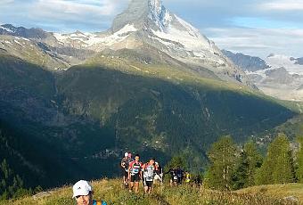 Pas bien réveillé et en ayant tout juste avalé un rapide petit déjeuner, je me présente dans les derniers rangs sur la ligne le lendemain matin. Je n'y suis vraiment pas. Après deux kilomètres sur la route, la pente commence à s'élever à travers un joli sentier. J'ai beaucoup de mal à trouver mon rythme. Difficile d aller plus vite que lors de mes dernieres rando-courses.Comme tous ces derniers temps, j'ai aussi beaucoup de mal à courir dans un peloton, surtout que là le niveau général me parait assez bon et je suis totalement noyé dans la meute. Au bout de 5kms je m'arrête prendre quelques photos et j'ai une forte envie de rebrousser chemin. Pareil au 10e. Mais je me dit que je n'aurai alors plus trop le temps de voir grand chose autour de la course et que tout de même le paysage vaut le coup. A l allure où je vais je peux en effet prendre un peu de temps pour admirer ces fantastiques panoramas sur le Cervin et les glaciers environnants.