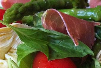 4/ Dressage : déposer de la roquette, des tomates cerises coupées en deux, les coeurs d’artichauts coupés en deux aussi, les asperges, le jambon de parme en petite chiffonnade, et les feuilles de basilic. Un filet d’huile d’olive, de la fleur de sel et le tour est joué !