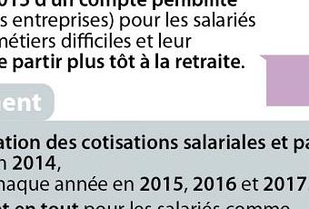 Création d’un «compte-temps» pénibilité. La réforme prévoit également la mise en place d’un «compte personnel de prévention de la pénibilité» dès 2015. Il permettra aux salariés de se former pour un métier moins pénible, de financer un maintien de rémunération en cas de passage à temps partiel ou de partir plus tôt à la retraite. Cette mesure devrait coûter 500 millions d’euros et sera financée par une cotisation à la charge des entreprises. Environ 20% des salariés du privé sont concernés.