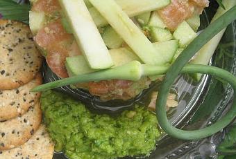 Congelez le saumon 15 minutes puis coupez-le en brunoise. Dans un bol de format moyen rempli de glace, déposer un petit bol, ajouter les deux saumons et les autres ingrédients, en mélangeant doucement. Déposer quelques feuilles de persil italien dans l'assiette de service. A l'aide d'un cercle à pâtisserie ou d'une boîte de thon propre et ouverte par les deux bouts, monter le tartare sur les feuilles de persil dans les assiettes. Décorer le dessus de chaque tartare, en composant un damier avec 6 allumettes de pommes. Préparer un autre damier de pommes en allumettes à côté du tartare et ajouter quelques gouttes de sauce au bleu et de pesto à la fleur d'ail. Servir immédiatement.