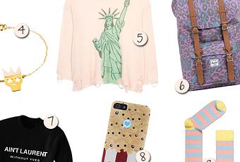 1. Collier double chaîne pompons (Human Nature) : 25 €2. Alloway Glitter (UGG Australia) : 80 €3. Carré de soie Love Peanuts (Codello) : 29 €4. Bracelet double Crown (Alphabeta) : 59 €5. Statut of Liberty (Wildfox) : 380 €6. Sac à dos Little America (Herschel) : 99 €7. Sweat Ain't Laurent (What about Yves) : 70 €8. Coque iPhone 5 Pop Corn (Be Priv Paris) : 15 €9. Stripe sock (Happy Socks) : 8 €10. Sandales sabots salomé Nano (Topshop) : 59 €11. T-shirt Yeah Mick (Be Priv Paris) : 35 €12. Bracelet Biarritz (Hipanema) : 85 €