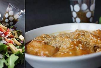Servir avec une salade mélangée, de l’oignon rouge ciselé, des tomates cerises et des courgettes marinées dans les épices et le balsamique