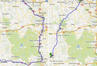 Ma route fut des plus plaisantes. Il n’y avait personne sur des routes agréables entourées de beaux paysages. Il fallait juste ralentir dans les quelques villages traversés, sans que cela ne ralentisse vraiment le chemin. Je rejoignis Longwy où, grâce à ma connaissance de la ville, je pus facilement retrouver les pompes à essence luxembourgeoises et continuer ma route dans les meilleures conditions.