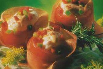 6 grosses tomates à farcir, 6 œufs, 6 tranches fines de jambon de Bayonne, vinaigre, 20 cl de crème fraîche,