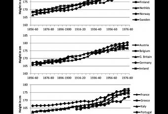 Des différences d’évolution nord-sud : Dans les pays d’Europe du Nord et centrale, l’augmentation de taille s’accélère dans la période couvrant les deux guerres mondiales et la Grande Dépression, une période difficile, qui, de plus précède les grands progrès de la médecine. Simultanément à cette augmentation de taille et à cette baisse de mortalité infantile, la fécondité baisse. En revanche, dans le sud de l’Europe la taille a augmenté plus rapidement dans la période d’après-guerre.