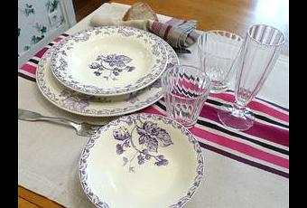 Et puis, lorsque nous avons fait escale à Valençay, j'ai réussi à persuader Claude de faire un détour jusqu'à Gien. Une petite escapade jusqu'au magasin de vente de l'usine pour l'achat de pièces de fins de séries ou présentant de légers défauts. Alors que les assiettes "nickel chrome" sont normalement vendues autour de 25€ pièce, on en trouve ici à 8€. J'ai craqué pour un petit ensemble de 6 assiettes plates et creuses du motif "Mûres" qui s'accorde avec mes assiettes "Chèvrefeuille" rose. Un seul regret : la série "Fleurs de Chine" avec ses pivoines vertes, est définitivement arrrêtée.