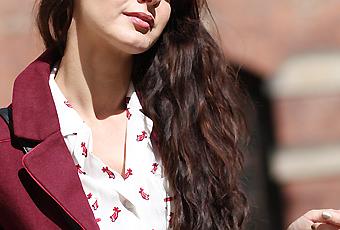 Pour ce qui est de cette tenue, c’est un look que je me verrais bien porter tout l’automne. Du bordeaux, une blouse en crêpe de viscose à l’imprimé preppy super mignon, un caban bordeaux boosté avec des galons corail, une tenue d’étudiante presque studieuse que j’adore tout simplement. Et ces couleurs, cette flanelle douce me rappellent une ambiance british qui n’est pas pour me déplaire. Ca me donnerait presque envie de retourner sur les bancs de la fac’, tiens !