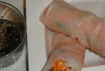 Au moment de servir, a joutez le sésame dans la sauce et mélangez. Enlevez le film étirable des rouleaux et servez- les accompagnés d'une coupelle de sauce