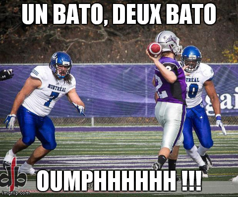 Les réguliers du blogue auront constaté la semaine dernière que le pivot des Piqueurs n'avait pas suivi nos conseils ayant été victime de 7 sacs et d'une myriade de hits après-passe. Comme nous avons à coeur la sécurité des athlètes-étudiants, nous avons pensé à éditer un MEME pour s'assurer que le joueur offensif de la semaine CIS #12 J. Heather se conscientise aux dangers qui le menace vendredi soir.