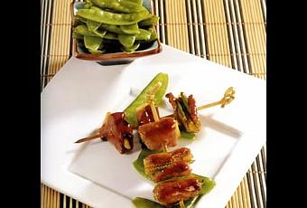 - Aplatir légèrement les aiguillettes de canard. Déposer sur chaque aiguillette quelques pois gourmands et un demi-épi de maïs. Rouler le tout, puis enfiler sur des piques en bambou.