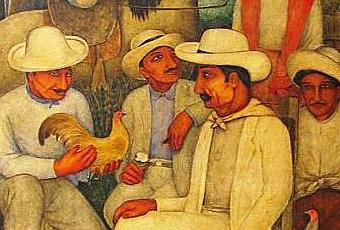 La composition est presque circulaire, compacte. Le regard suit une spirale qui débute sur la chaussure d’un homme assis au premier plan, et se termine sur le coq que soutient un autre homme. On ressent une impression de paix après une bonne conversation, et dans l’arrière-plan on voit un village de petites maisons faites de bois et de feuilles de palmes. Six paysans cubains sont représentés sur ce tableau d’Abela aussi connu que plagié. Ils ont le visage tanné par le soleil et des traits vaguement indigènes. Ils sont magnétiques, irrésistibles. Notre regard se dirige aussi vers les détails de leur habillement. Tous « sur leur trente et un », chapeaux impeccables, manches longues, peut-être en toile amidonnée pour la circonstance.