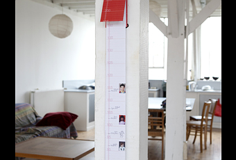 Conçue comme un album de famille à accrocher au mur, la toise familiale est dépliable et se fixe à 2m10 du sol pour permettre de mesurer vos enfants au fil de leur croissance.