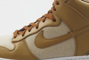 Les Nike Dunk High « Acorn » ont un dessus en canvas beige et cuir premium marron clair contrasté par une semelle intermédiaire blanche, une semelle extérieure marron et complété par des lacets de même couleur.