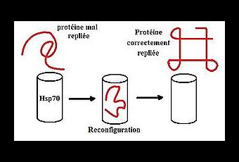 Explication du fonctionnement d'Hsp70. La protéine mal conformée pénètre dans Hsp shématisée sous forme d'un cylindre. Celui-ci va replier la protéine qui ressortira avec sa conformation définitive. (Wikipedia)