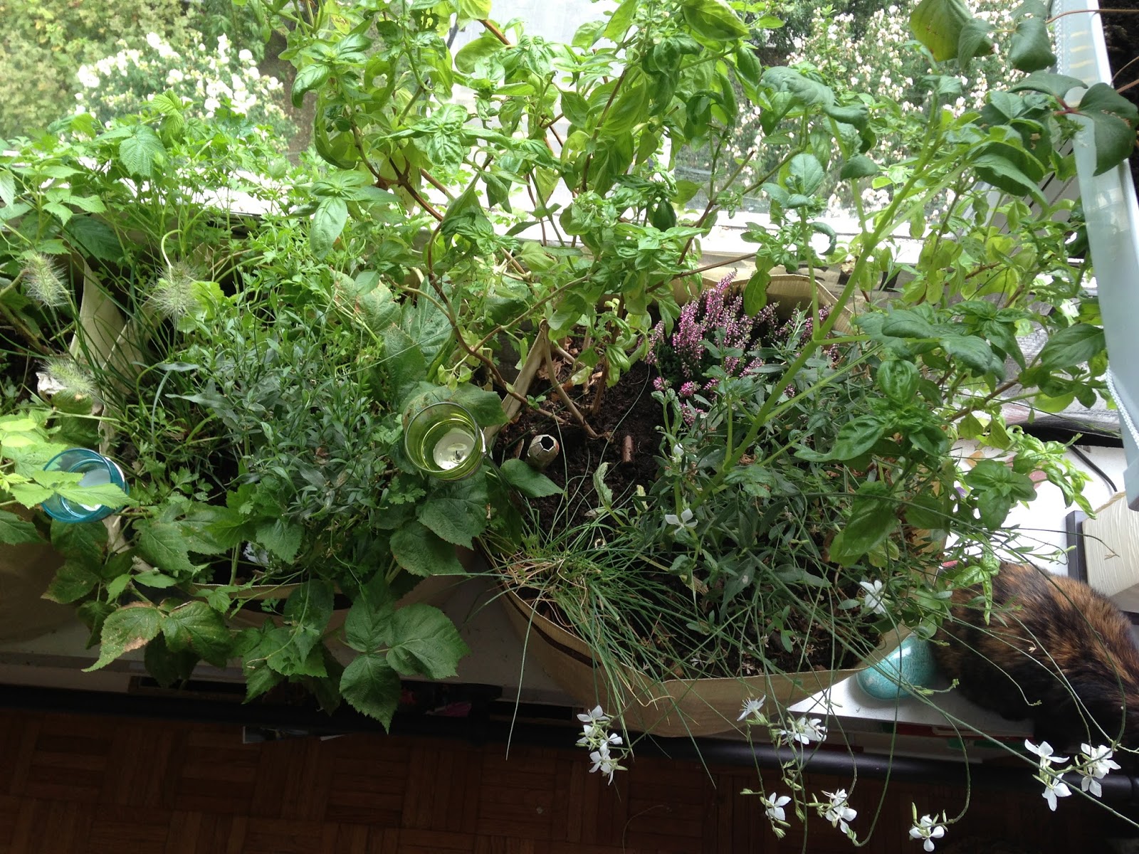 Petit à petit je plante aussi au potager des plantes de jardin rustiques et belles, qui supportent la sécheresse et la grosse chaleur car d'une part j'ai envie de mélanger plantes d'ornement, plantes à fleurs et plantes gourmandes (comprenez potagères !) et d'autre part il fait tellement chaud derrière ma fenêtre qu'il faut des plantes adaptées ! Alors je fais des essais, je verrai bien ce qui pousse bien en intérieur. Ce qui attise grandement la curiosité de mes voisins ! "Un jardin dans votre appartement ??", "c'est pour mettre à l'intérieur ces jolies fleurs ??"