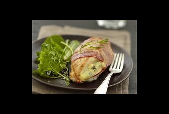 Enroulez chaque suprême ainsi préparé, d’une fine tranche de lard, en la collant sur elle même.