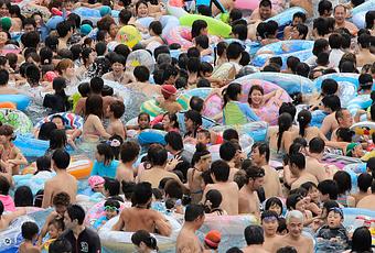 Piscine géante au Tokyo Summerland d’Akiruno le 4 août 2013. 12 000 personnes trouvent place dans l’eau pour tenter de se rafraîchir de l’été brûlant. (Crédit : Itsuo Inouye/Associated Press)
