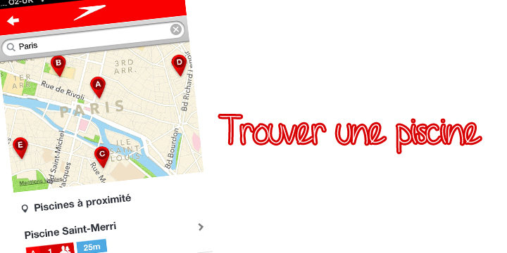 Cette toute nouvelle application (disponible depuis hier sur l'App Store) permet, entre autres, de trouver une piscine par géolocalisation automatique, ou par ville (territoire français exclusivement). L'application renseigne notamment le type de bassin (extérieur/intérieur) ainsi que sa longueur (25m/50m).