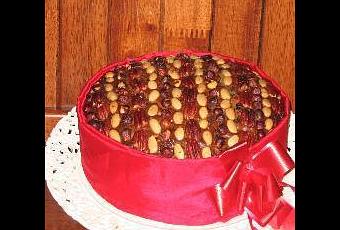 Verser dans un moule préparé Décorer avec des noix et cerises supplémentaires, si désiré.