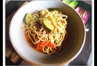 Pour 2 : - 1 plaque de noodle- 1 petite courgette- 1 grosse tomate- 2 càs de sauce sukiyaki (Kikkoman)- sel- poivre long de java (ici)
