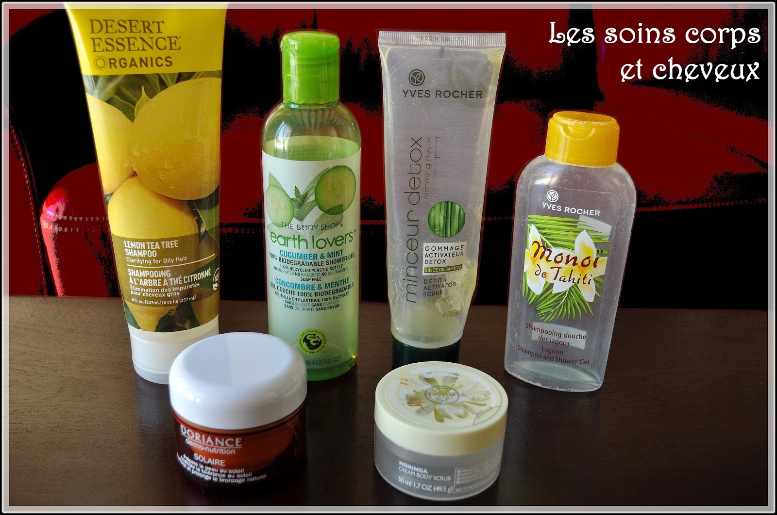 Passons maintenant aux soins corps et cheveux :- Shampooing à l'arbre à thé citronné DESERT ESSENCEAcheté sur Iherb, ce shampooing est vraiment pas mal. Je l'ai utilisé en alternance avec mon chouchou Jonnie Juniper de Lush et il nettoyait très bien mes cheveux gras sans les alourdir, tout cela grâce à sa compo plus clean que d'autres... J'avais peur que l'odeur soit trop présente (je vous rappelle que j'aime pas le citron) mais pas du tout. Je l'ai donc déjà racheté...- Gel douche concombre et menthe THE BODY SHOPAutant le dire tout de suite : j'ai détesté ce gel douche. C'est le dernier de cette gamme que j'avais dans mes placards (ouff) et heureusement ! L'odeur est pas mal, assez fraîche pour l'été mais que ce produit est liquide, on dirait de l'eau ! Du coup, on a vite fait de vider le tube, surtout qu'il ne mousse pas des masses... Bref, je ne le rachèterais pas !- Gélules solaire DORIANCE Depuis la mi-juin, je prends ces gélules (j'arrive à la fin de mon dernier pot) et je n'ai pris aucun coup de soleil cet été ! Pourtant, ce n'est pas faute de m'être exposée... Et puis cette année mon bronzage est bien uniforme et d'une jolie couleur. Je suis donc ravie des ces gélules, que je rachèterais certainement l'année prochaine.- Gommage Activateur Detox YVES ROCHERJ'ai ce produit depuis des plombes dans ma douche, vous comprendrez donc que je ne suis pas satisfaite de ce produit. En fait, le coté gommage est pas mal car les grains sont assez gros mais coté minceur...ba j'attends encore. Pas la peine de prendre ce genre de produit, un simple gommage fait tout aussi bien l'affaire pour préparer la peau à l’application d'une crème minceur !- Crème exfoliante au Moringa THE BODY SHOPEn parlant de gommage, en voici un très bien ! Sa texture crème est assez douce pour la peau et cela même si les grains sont assez gros. Quant à l'odeur...ouaahh j'adore ; elle est un peu forte mais cela ne m'a pas dérangé. Je le rachèterais volontiers... quand je verrais le bout de mes exfoliants que j'ai d'avance !- Gel douche au Monoï de Tahiti YVES ROCHEROn ne présente plus ce gel douche à l'odeur si exquise ! A la fois shampooing et gel douche, il nettoie très bien en apportant cette odeur de vacances que l'on aime tant. Moi je préfère l'utiliser en gel douche après la piscine ou la mer pour enlever le sel. Compte tenu de son petit prix, je le rachèterais certainement l'été prochain !Vous voyez, je ne vous ai pas menti, j'ai terminé pas mal de soins cet été !! Connaissez-vous certains de ces produits ? Si oui, n'hésitez pas à me laisser un petit mot pour me donner votre avis !Des bisous et à très vite pour la suite de mes produits finis !