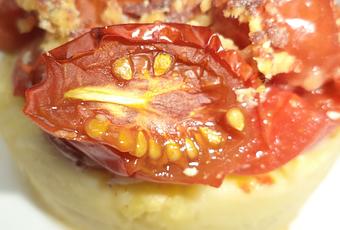 Couper les tomates en 2, les mettre dans un plat et répartir le crumble dessus.Enfourner pour 20'.