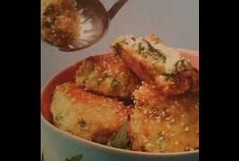 Aplatir la boule et la passer dans l’œuf battu puis dans la mie de pain + sésame