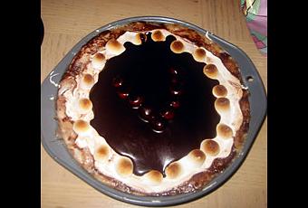 Verser la garniture au caramel sur le gâteau. Laisser refroidir complètement Fais avec la garniture fouettée, saupoudrer avec des friandises Réfrigérer pendant au moins 2 heures avant de servir