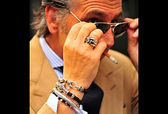 Que les lecteurs de Milanese Special Selection se rassurent, je ne vais pas les convier ici à une célébration de la gourmette (paix à ses cendres), mais, de manière plus raisonnable, à l’examen d’une tendance de plus en plus répandue en Italie, à savoir le port du bracelet par des hommes de tous âges occupant des fonctions très diverses. Là où la logique voudrait en effet que ce genre d’article soit réservé à des personnes jeunes, préservées pour quelque temps encore des contraintes professionnelles et des codes vestimentaires qui les accompagnent, on remarque chez certains individus plus… mûrs (des icônes de la mode en premier lieu, mais aussi bien des grands patrons plus libres d’égayer leur tenue comme ils le souhaitent) la volonté de plus en plus nette d’affirmer leur personnalité grâce aux accessoires.