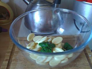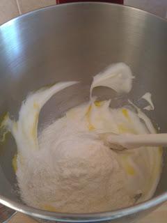 - puis la farine, fécule de pomme de terre tamisée et remuez le tout délicatement avec une spatule en plastique