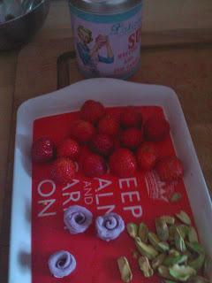 - et c'est là que ça s'est corsé car ma crème n'avait pas montée, du coup je l'ai quand même versé le long des fraises et remis le tout au frais 1 heure environ pour que cette crème durcisse un peu