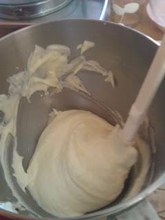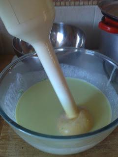 - quand la crème ivoire/pistache a bien durci, montez la en crème chantilly et remettre cette crème au frais, qu'elle soit prise ou pas