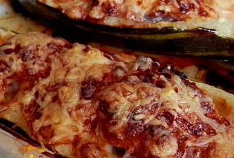 Remplir chaque moitié de courgette précuites, que vous aurez au préalable légèrement salée, avec un peu de farce porc-marrons-cognac.