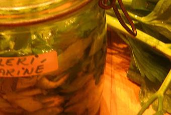 Parce que les pieds de céleri ont été cueillis aujourd'hui. L'heure de la dernière prolongation ayant sonnée avant le gel au sol annoncé. Certains pieds seront parés et congelés, quelques-uns seront consommés frais pendant la semaine et l'un d'eux, ainsi mariné. Question de tester et de pouvoir en conserver au frigo pour des préparations à sandwichs ou salades, en ce début d'automne.