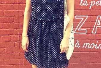 Il s'agit d'une robe ZARA, bleue marine, à pois, un brin rétro, légère, facile à porter et qui peut aussi bien être revêtue pour un mariage (accessoirisée d'un joli sac et de beaux escarpins) ou pour une virée urbaine, en mode plus décontract'.