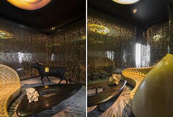A partir de ces trois évocations réinterprétées avec brio, Bruno Moinard joue avec les symboles mais aussi et surtout avec le temps, pour que métamorphose et modernité s’épousent. Une table basse triangulaire en ébène, au centre du salon, semble comme suspendue, en lévitation. En forme de galet, le temps s’y est arrêté, imprimant ainsi dans le bois précieux un nouveau changement. Une méridienne capitonnée de velours-galuchat et maintenu par de petites billes en verre Murano offre un confort insoupçonné.