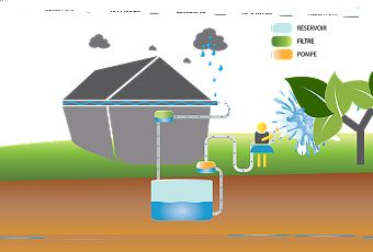 L’eau captée à partir des gouttières de la toiture, comme dans un système conventionnel, est filtrée, ce qui empêche les débris, les feuilles mortes et les insectes de s’introduire dans le système. Au lieu de s’infiltrer dans le sol, celle-ci est plutôt stockée dans des réservoirs hors terres ou souterrains. Lorsque dans le réservoir, le renouvellement de l’eau est assuré par un système de circulation pour éviter la prolifération de bactéries, d’algues et de mauvaises odeurs causées par l’eau stagnante. Une pompe s’ajuste au boyau d’arrosage conventionnel ou aux tuyaux de la plomberie pour permettent divers usages quotidiennes ne requérant pas d’eau potable. On peut donc utiliser l’eau de pluie pour laver la voiture, arroser le jardin, irriguer le terrain, remplir la piscine, et même pour alimenter la toilette et la laveuse.