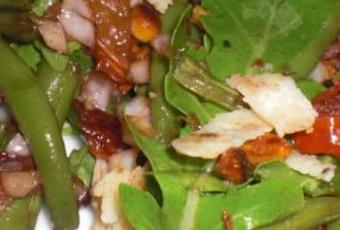 - Au moment de servir ajoutez les pignons de pin, le lard émiettez, la roquette, le basilic déchiquetez et les copeaux de parmesan.