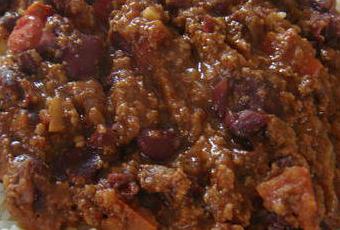 Pour 4 personnes : 120 g de riz blanc, 2 cc d'huile, 250 g de steack haché à 5% ou plus suivant si vous voulez un plat light ou non, 1 gousse d'ail, 3 oignons émincés, 1 grosse boite de tomates pelées ou 3 grosses tomates, 1 poivron rouge épépiné et coupé en petits dés, 1 boite de haricots rouges ( 280g), épices à chili, sel et poivre.