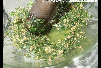 Dans un bol, pilez l'ail et la pimprenelle. Ajoutez l'huile petit à petit. Puis finissez par le sésame.
