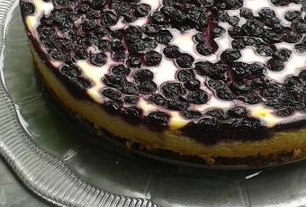 Démoulez le cheesecake sur un plat et servez-le accompagné de coulis de myrtilles et décoré de myrtilles fraîches (facultatif).