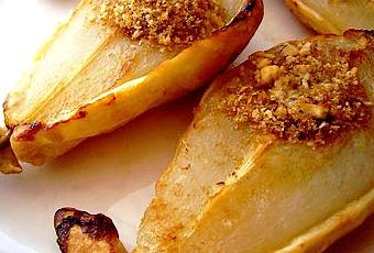 5. Répartissez ce mélange dans la cavité des poires. Parsemez de beurre en parcelles puis repassez les poires 5 minutes à four chaud.